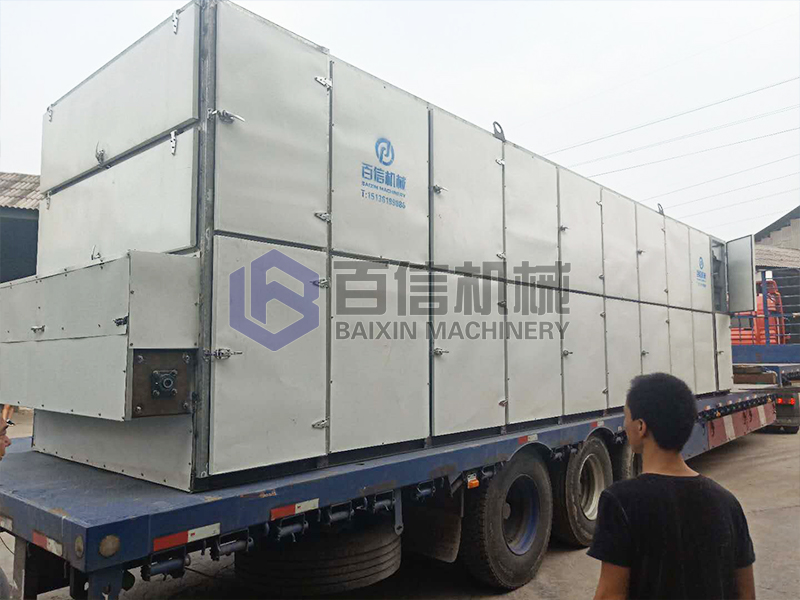 辣椒裝到上料輸送,由均料器將辣椒平鋪在上料輸送,跟隨輸送機上升,到達烘干機頂部,從頂部逐層下降到底部。在此期間,熱風由下往上透過物料網帶之間的空隙將辣椒烘干,到達底部由出料器送至出料輸送機。
